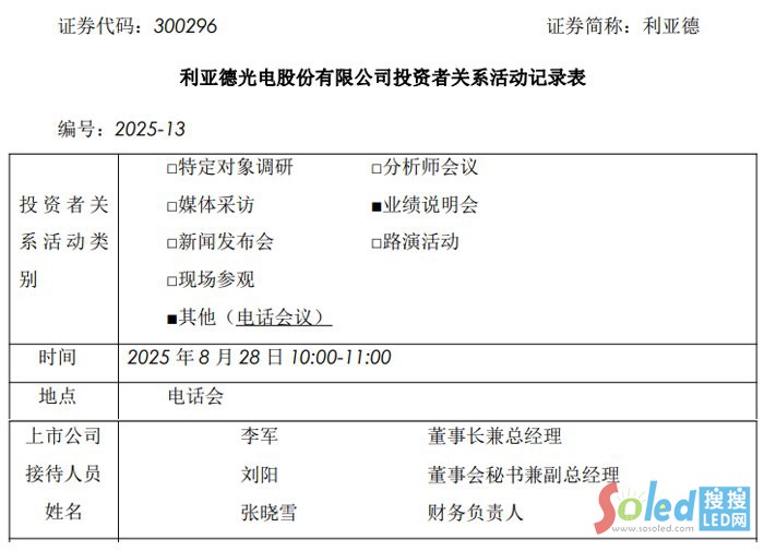 近日,利亞德光電股份有限公司(證券代碼:300296,證券簡(jiǎn)稱:利亞德)以電話會(huì)議形式舉辦投資者關(guān)系活動(dòng),公司董事長(zhǎng)兼總經(jīng)理李軍、董事會(huì)秘書兼副總經(jīng)理劉陽(yáng)、財(cái)務(wù)負(fù)責(zé)人張曉雪出席,與中金、國(guó)信證券、匯添富基金、紅杉中國(guó)等數(shù)十家機(jī)構(gòu)投資者深入交流,解讀 2025 年半年度業(yè)績(jī)亮點(diǎn),并披露技術(shù)創(chuàng)新、海外布局及 AI 戰(zhàn)略等核心進(jìn)展。